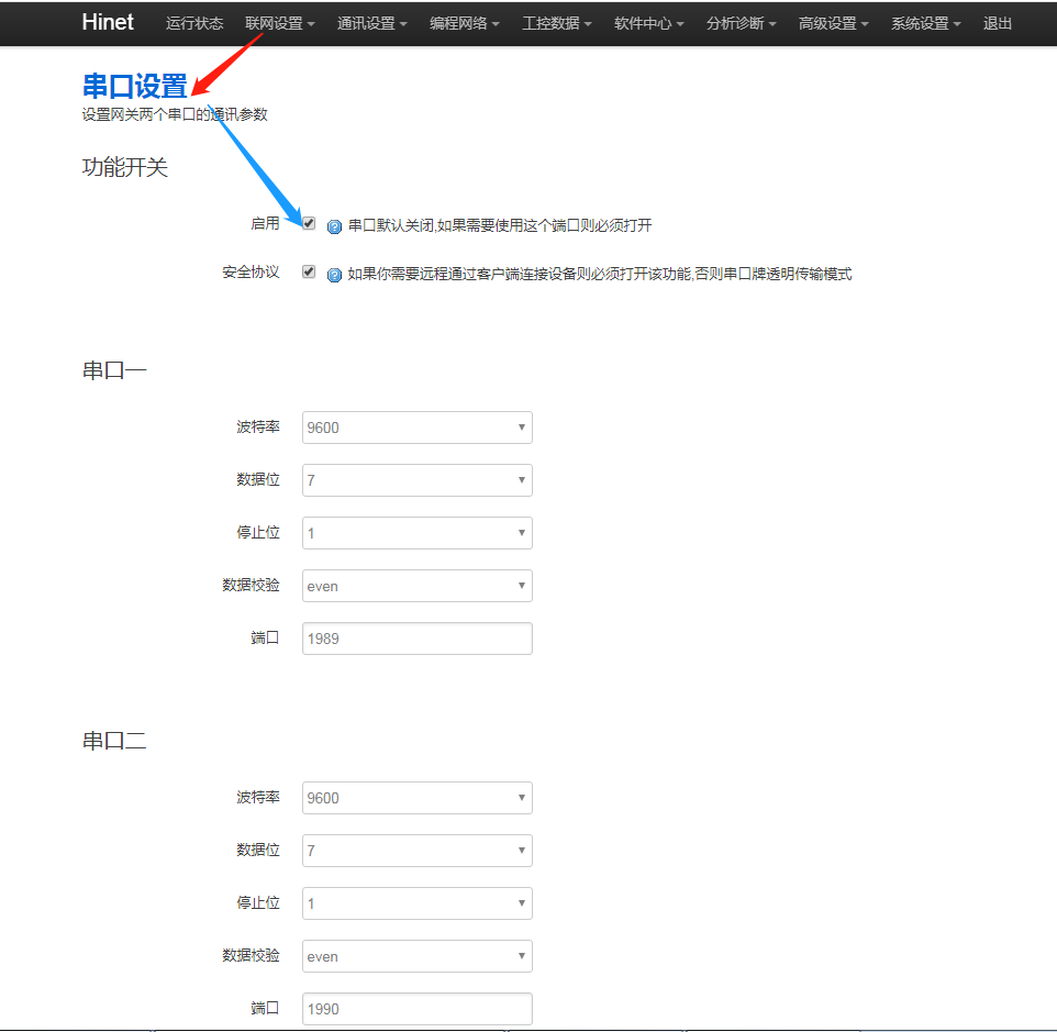 1. 如果是串口PLC,檢查串口是否打開,以及串口的端口是否正確,進(jìn)網(wǎng)關(guān)后臺“通訊設(shè)置 - 串口設(shè)置”,勾選【啟用】,串口一的端口為1989,串口二的端口為1990。